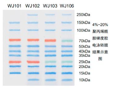 WJ 101由15kDa~150kDa范围的9个蛋白条带组成(15kDa、20kDa、25kDa、35kDa、40kDa、50kDa、70kDa、100kDa、150kDa)。WJ 102、WJ 103和WJ 106由10kDa~250kDa范围的11个蛋白条带组成(10kDa、15kDa、20kDa、25kDa、35kDa、40kDa、50kDa、70kDa、100kDa、150kDa、250kDa)。由低到高的分子量范围可监测电泳过程中的蛋白分离情况、判断目标蛋白的分子量,并且可以监测Western Blot实验中的转膜效率。25kDa、70kDa两条带结合有红色或绿色染料,更便于实时观察电泳进程、判断蛋白分子量,其中 WJ 106 特别适用于近红外荧光成像系统。本品推荐上样量为5μL。