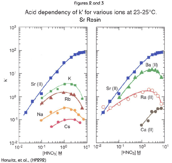 Sr树脂对锶的吸收随着HNO3浓度的增加而增加。在8M HNO3时,Sr的k'大约是90。在HNO3浓度低于0.05M时,Sr的k'值下降到小于1。在所示的HNO3浓度范围内,碱和碱土金属(图2和3)对树脂的亲和力比锶低得多。在鹼土金屬中,Sr樹脂對鈣的吸收率最低。因此,将Sr与Ca分开相对容易。从其他碱土金属阳离子中分离Sr的历史方法是繁琐的,需要使用的烟熏HNO3进行多次沉淀。钡的保留率高于Ca或Ra。然而,Ba的吸收在大约3M HNO3时达到峰值,在更高的浓度下下降。为了确保在Sr分析中充分净化Ba,从8MHNO3中将Sr加载到树脂上。充分冲洗后,Ba将从柱子中洗净,留下纯的Sr分数。